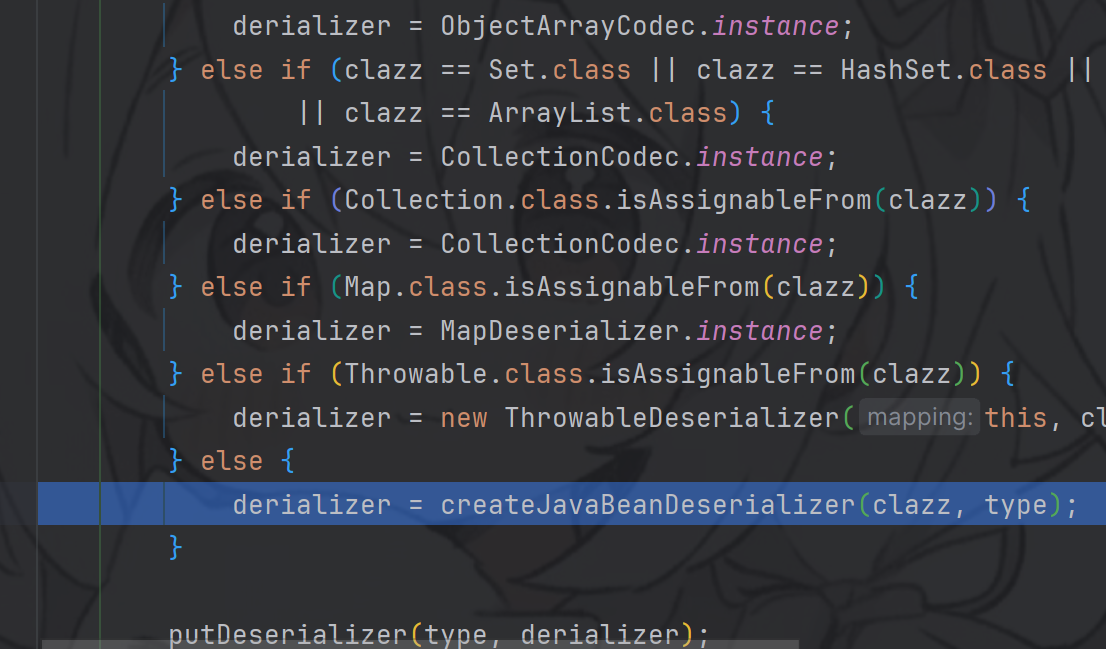 进入默认的反序列化器JavaBeanDeserializer中进行反序列化,其中下面代码会触发setXXX方法