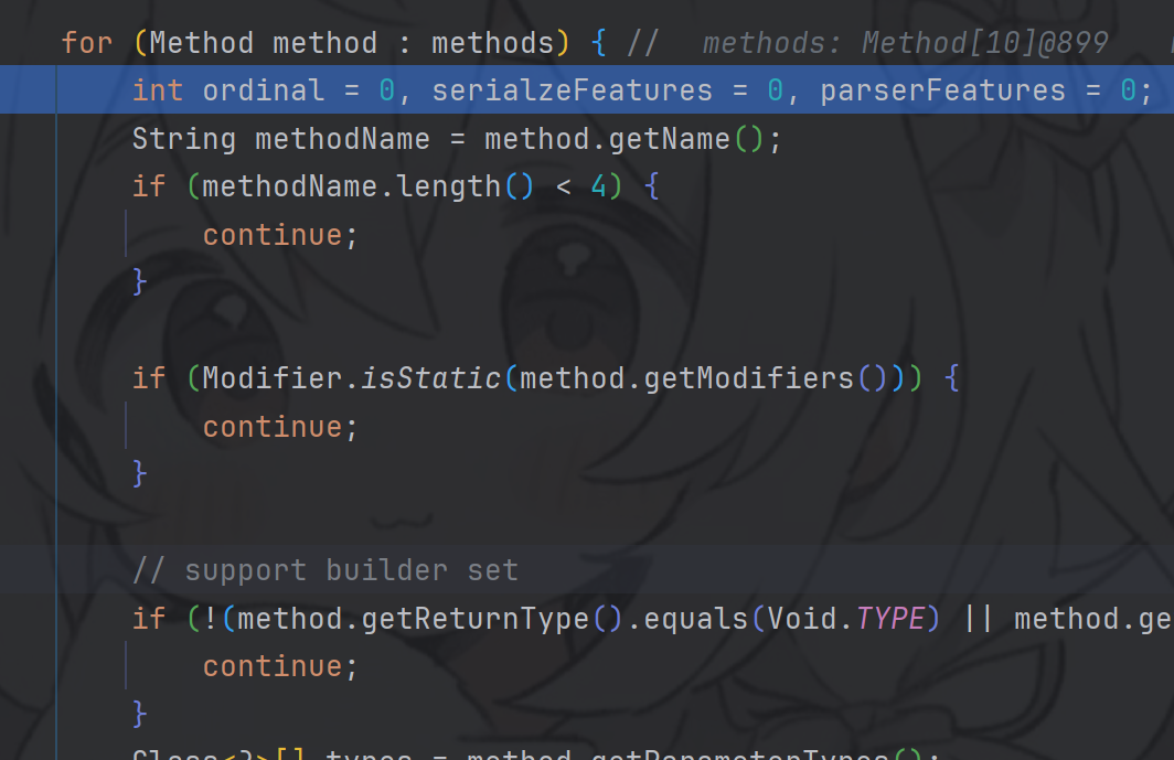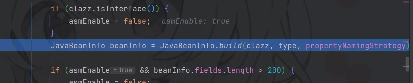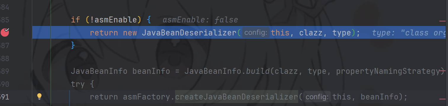 起初asmEnable为 true,会走下面代码(也就是前面不能调式的代码)。如果asmEnable是false,就会直接创建一个JavaBean反序列化器(就不需要使用ASM创建一个临时的类了)。这样,后面代码可以继续调试。