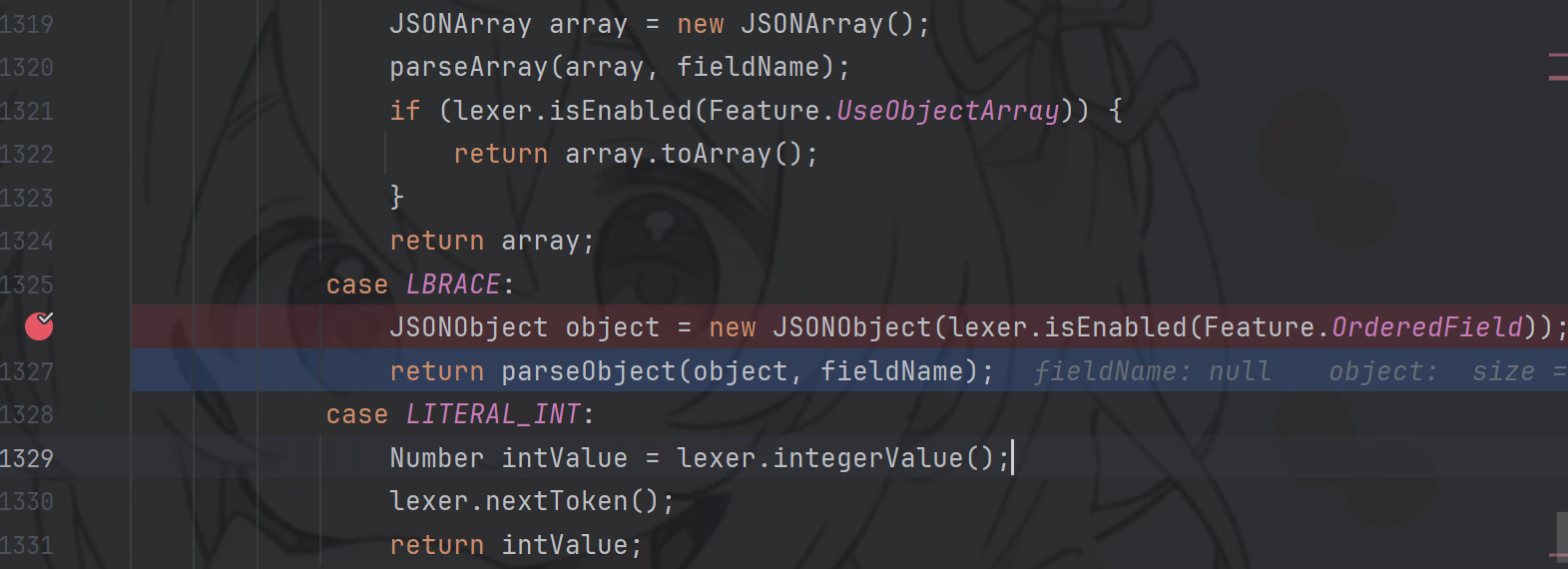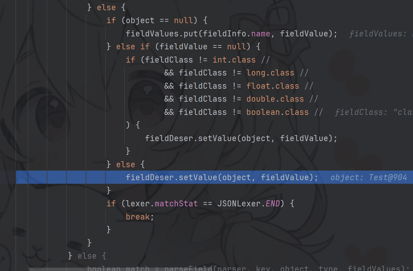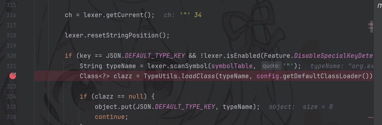 发现后面代码调试不了,这是因为前面ASMDeserializerFactory 是用利用ASM重新生成类(ASM操作字节码),因为这个反序列化器类是代码生成的,在内存中,所以无法使用idea调试后面的反序列化操作