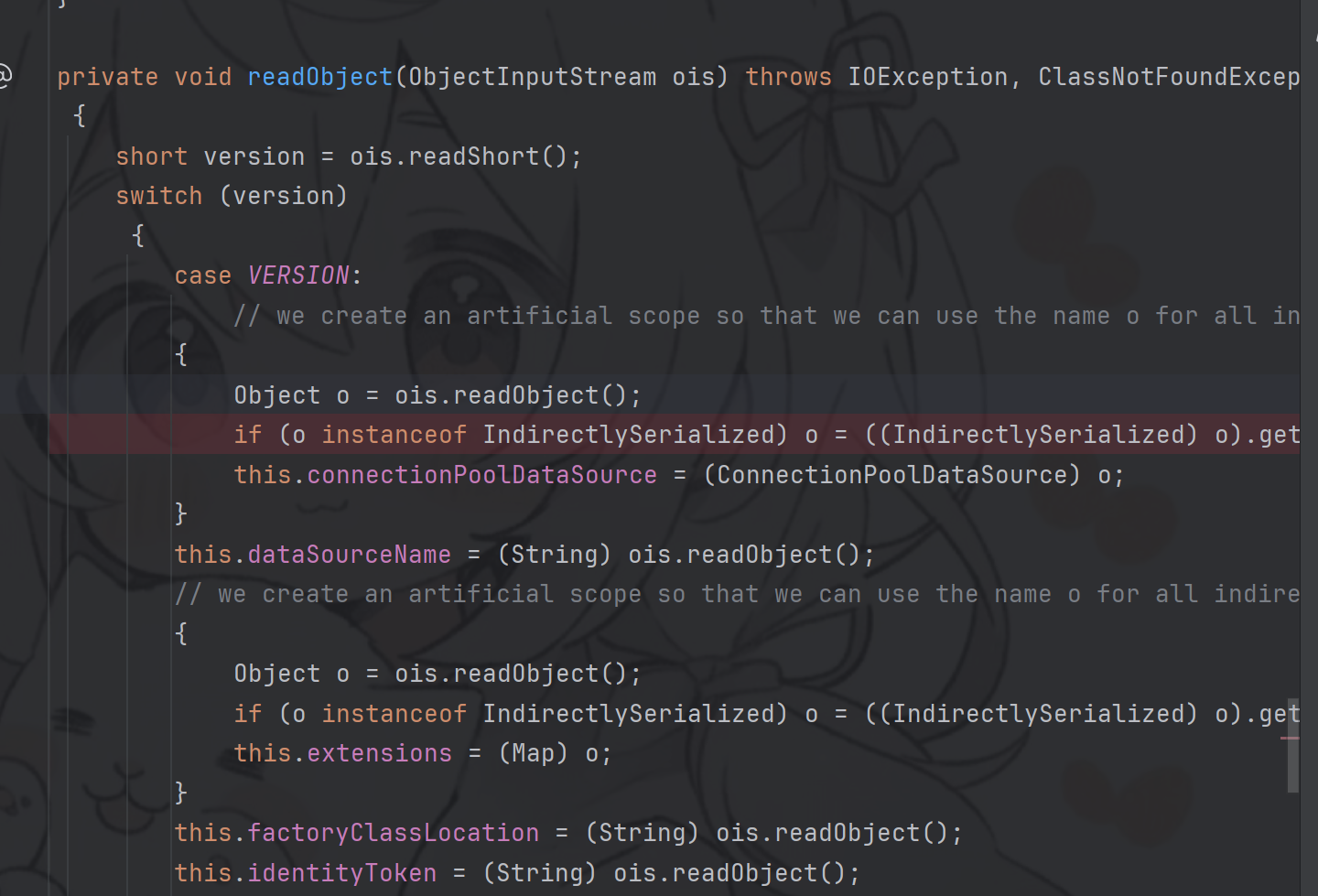 如果反序列化得到的类是IndirectlySerialized的实例,则会调用其getObject()方法,然后将返回的类转为ConnectionPoolDataSource类
