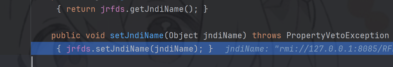 JndiRefConnectionPoolDataSource jndiRefConnectionPoolDataSource = new JndiRefConnectionPoolDataSource(); try { jndiRefConnectionPoolDataSource.setJndiName("rmi://127.0.0.1:8085/RFKMphyY"); jndiRefConnectionPoolDataSource.setLoginTimeout(2); } catch (SQLException e) { throw new RuntimeException(e); } catch (PropertyVetoException e) { throw new RuntimeException(e); }