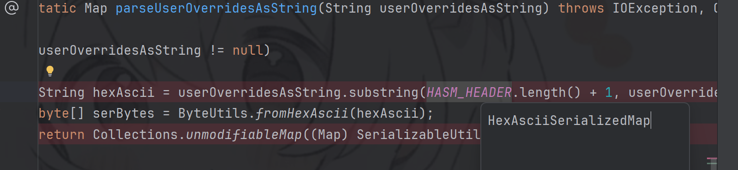这里会从默认前缀HexAsciiSerializedMap加上一个字符后开始截取真正的反序列化数据(那么payload就应该加上这个前缀)