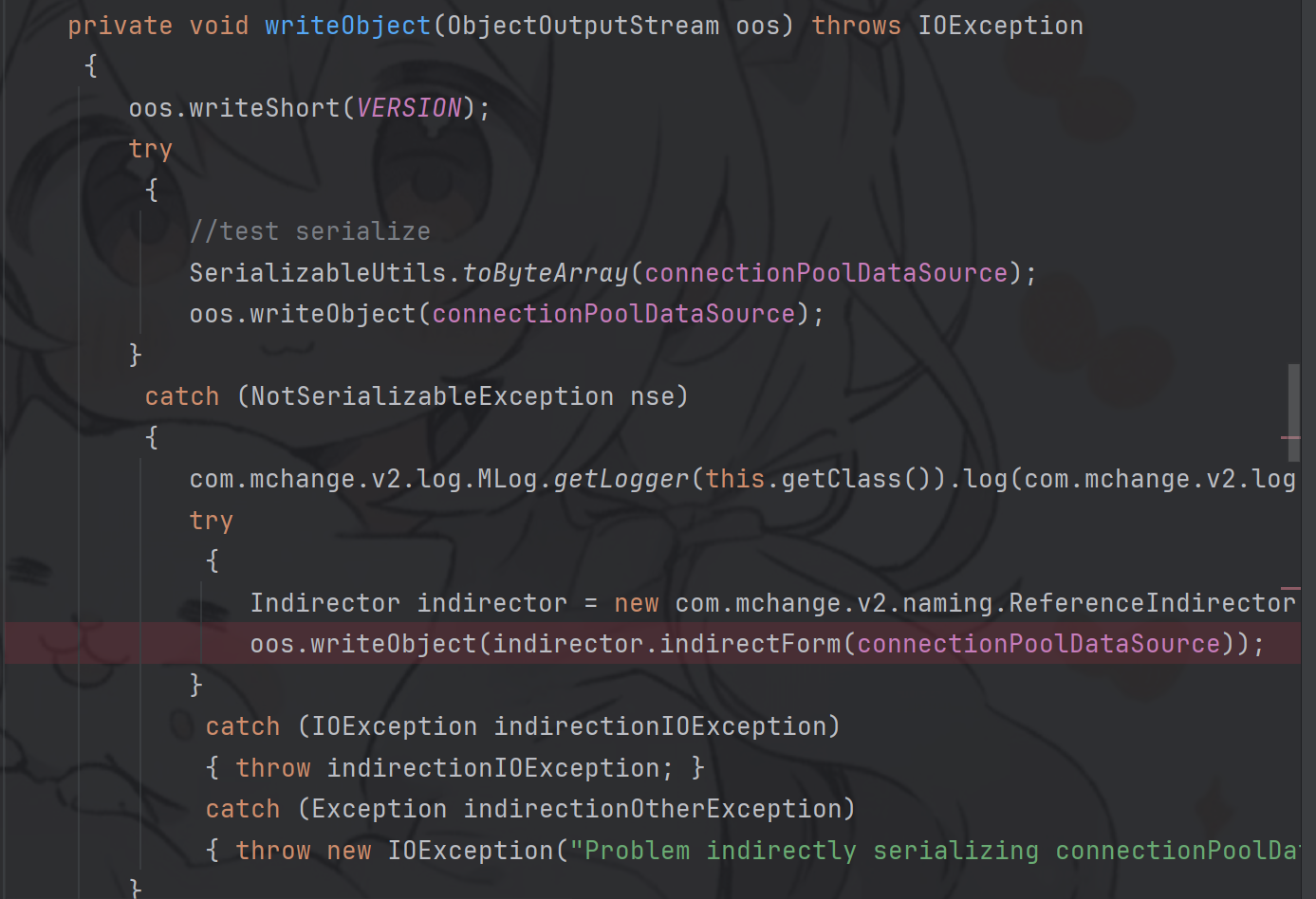 由于入口类writeObject的是connectionPoolDataSource属性,connectionPoolDataSource是一个接口没有继承Serializable接口(EXP就得实现这个接口才行),无法被直接序列化,因此走的是catch分支