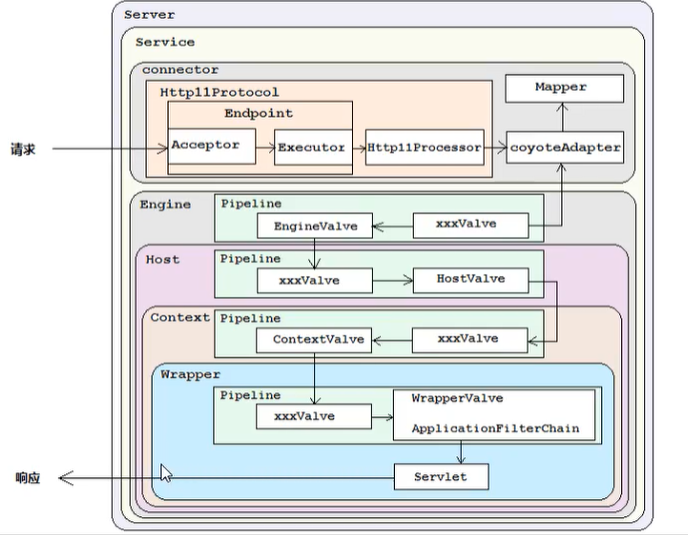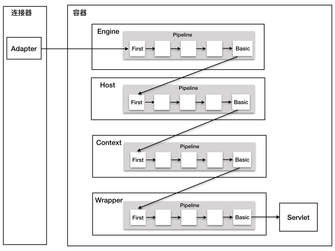 当Tomcat接收到客户端请求时,首先会使用Connector进行解析,然后发送到Container进行处理。那么我们的消息又是怎么在四类子容器中层层传递,最终送到Servlet进行处理的呢?这里涉及到的机制就是Tomcat管道机制。