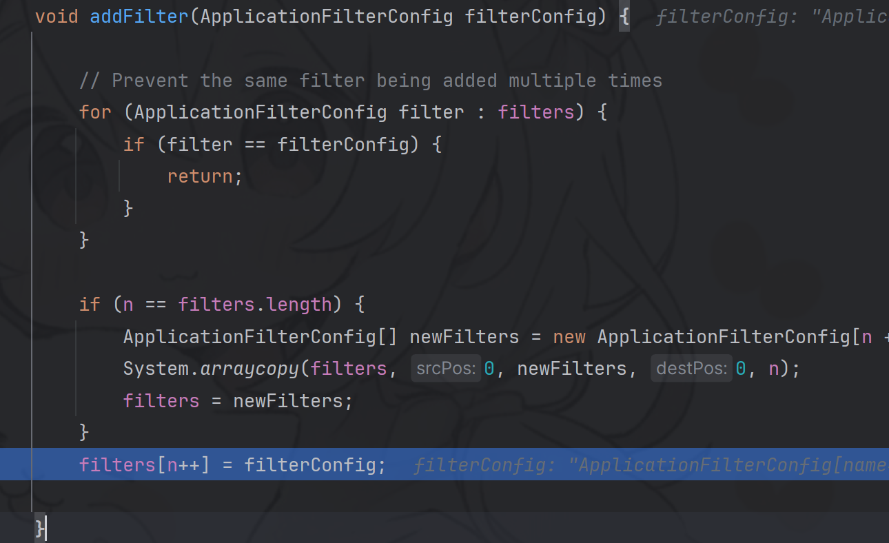 - 通过filterChain.addFilter(filterConfig)将一个filterConfig添加到filterChain中