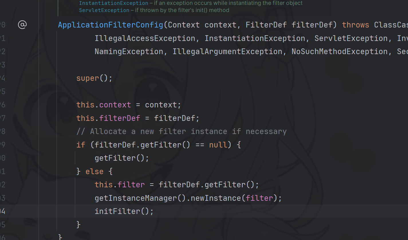 ,Filter内存马的思路就是,在放入FilterChain之前我们就通过反射赋值或者增加一些内容,然后tomcat就会自动的调用上面流程的代码,将恶意的filter放入filterChain,再进行调用调用其实如下图: