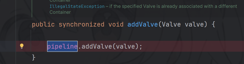 Pipeline pipeline = context.getPipeline(); pipeline.addValve(new Valve() { @Override public Valve getNext() { return null; }