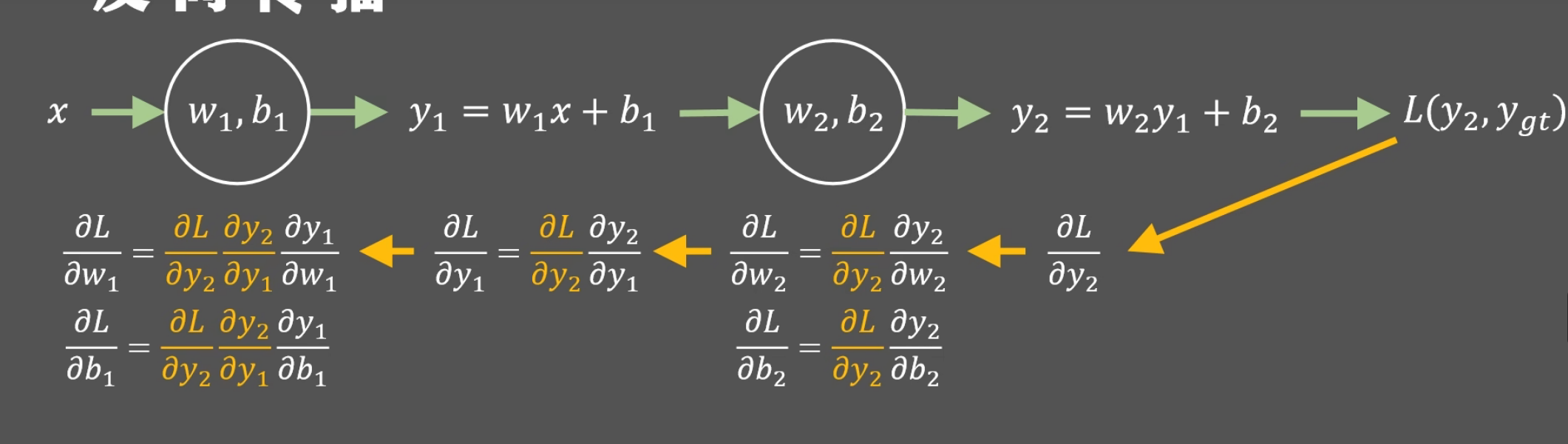 反向传播,根据上面一步的运算求出下一层次的偏导