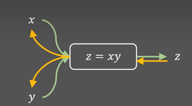 forward函数是前向传播,计算 z =x * y