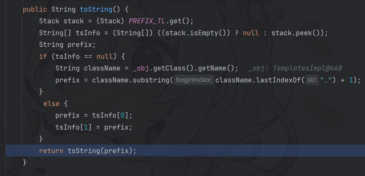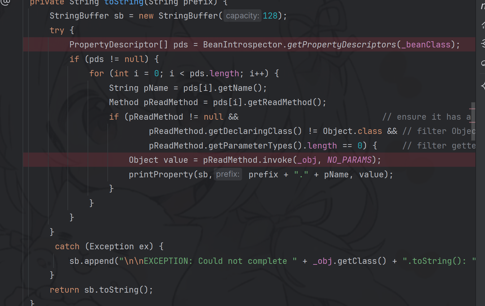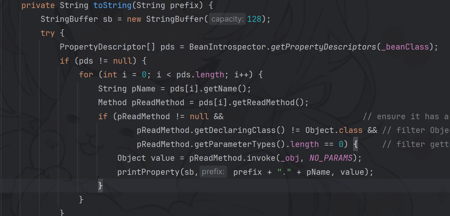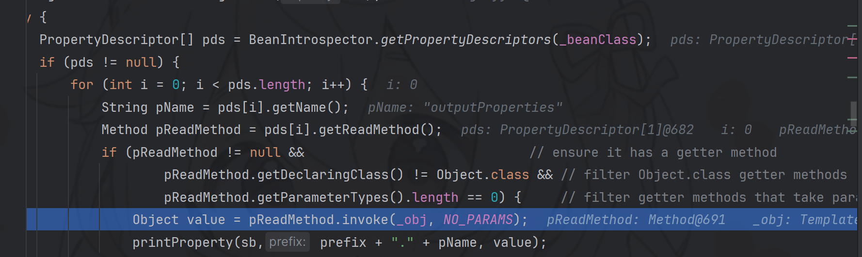 com.sun.syndication.feed.impl.ToStringBean是给对象提供toString方法的类, 类中有两个toString方法, 第一个是无参的方法, 获取调用链中上一个类或_obj属性中保存对象的类名, 并调用第二个toString方法. 在第二个toString方法中, 会调用BeanIntrospector#getPropertyDescriptors来获取_beanClass的所有getter和setter方法, 接着判断参数的长度, 长度等于0的方法会使用_obj实例进行反射调用, 通过这个点我们可以来触发TemplatesImpl的利用链. —-出自https://xz.aliyun.com/t/11200