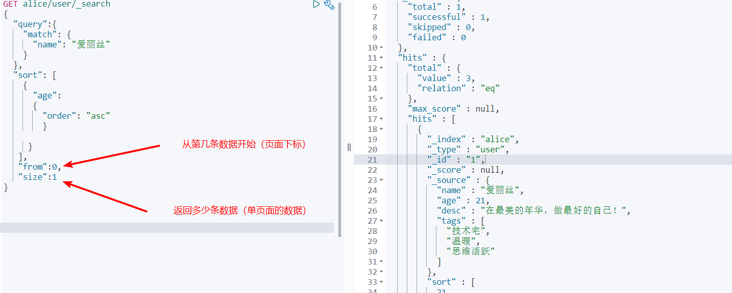 分页查询类似于我们SQL中的 limit 语句。在 es 中我们想要实现这样的效果只需要用 from 指定 从第几条数据开始,size指定返回多少条数据即可。