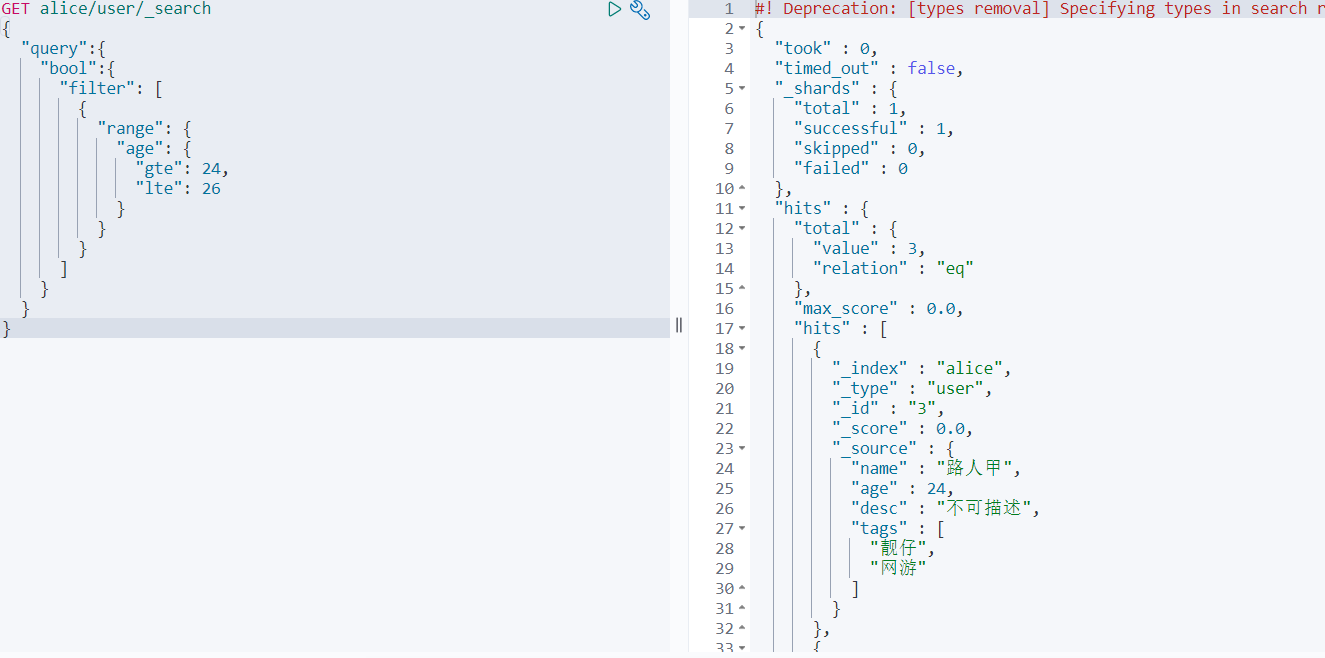 这里就用到了 filter 条件过滤查询,过滤条件的范围用 range 表示,其余操作如下 :
