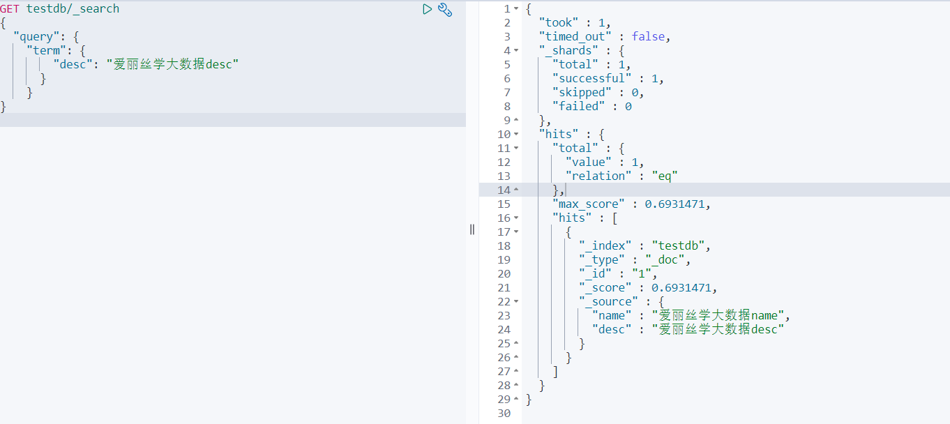 上述中testdb索引中,字段name在被查询时会被分析器进行分析后匹配查询。而属于keyword类型不会被分析器处理。