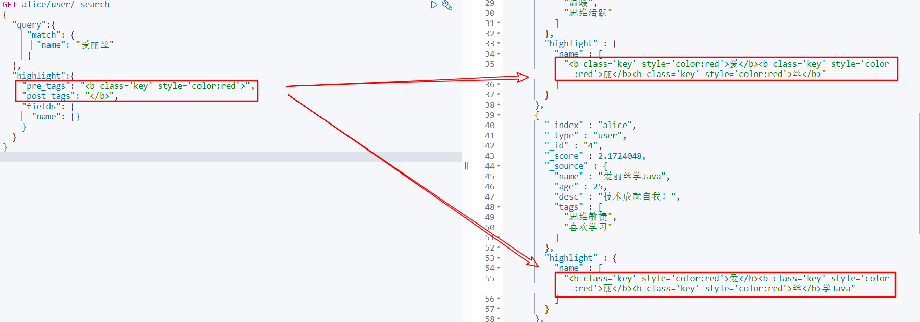 观察返回的结果,我们可以发现搜索相关的结果,被加上了高亮标签