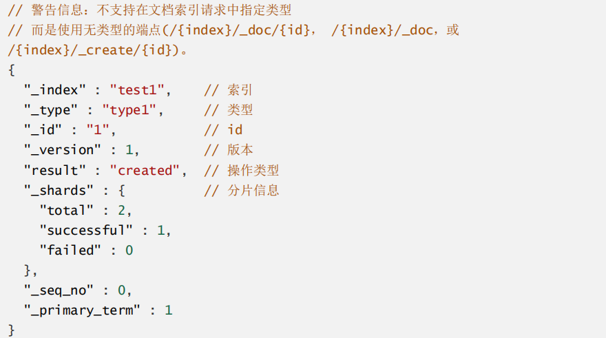 一个索引类型中,包含多个文档,比如说文档1,文档2。 当我们索引一篇文档时,可以通过这样的一个顺序找到 它: 索引 ▷ 类型 ▷ 文档ID ,通过这个组合我们就能索引到某个具体的文档。 注意 : ID不必是整数,实际上它是个字符串。