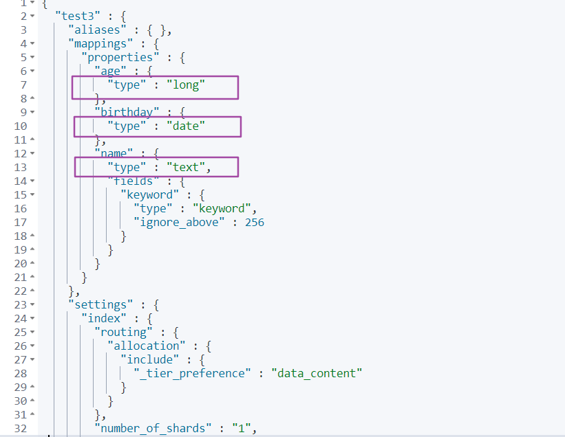 可以发现通过GET请求,我们能够详细获取到该索引下具体的信息,其中包含字段类型。那上面示例中字段类型是我自己定义的,那么我们不定义类型会是什么情况呢?