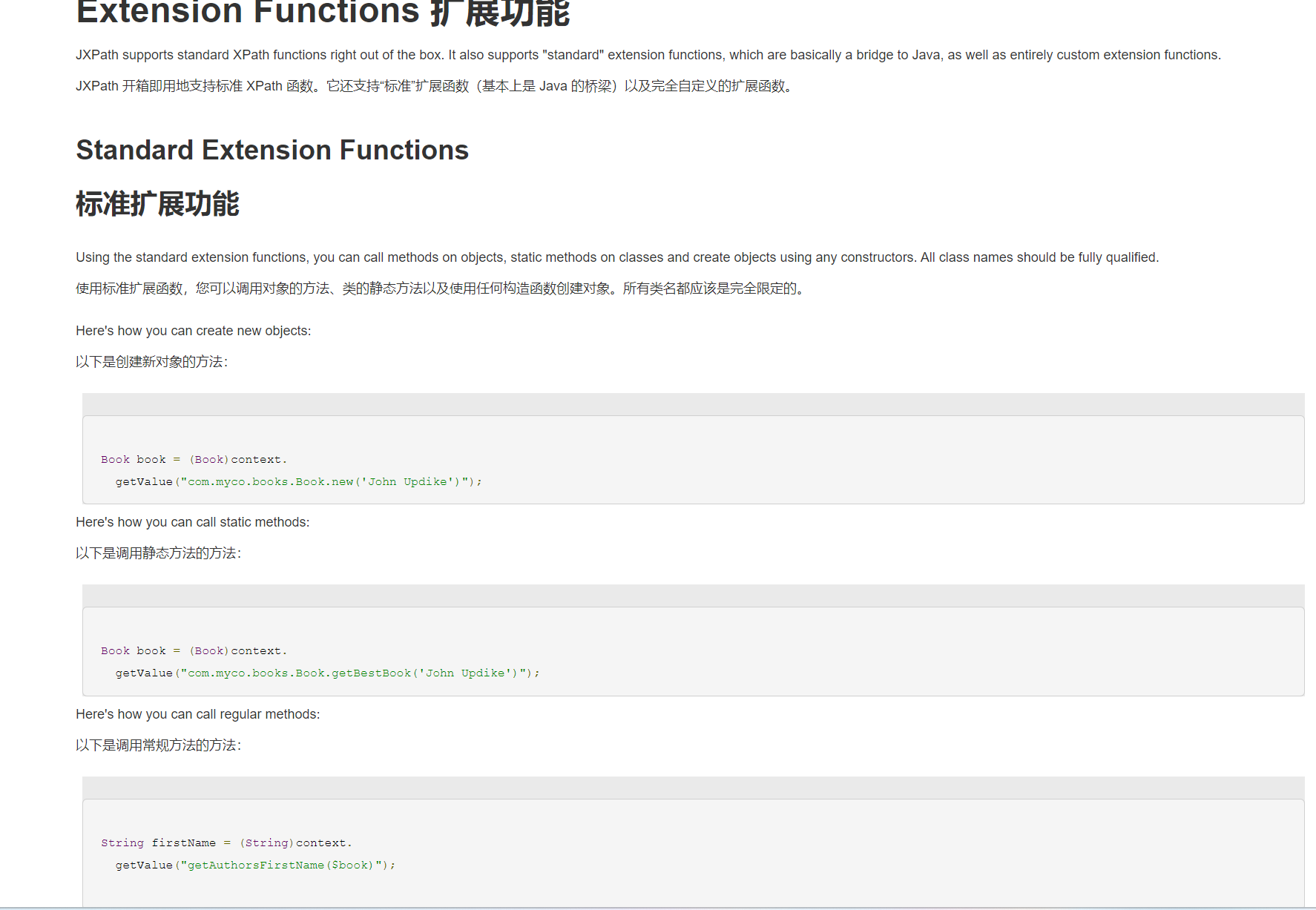 JXPath提供一个Extension Functions 扩展功能:JXPath 开箱即用地支持标准 XPath 函数。它还支持“标准”扩展函数(基本上是 Java 的桥梁)以及完全自定义的扩展函数。