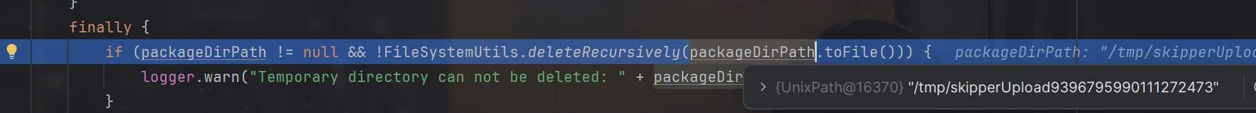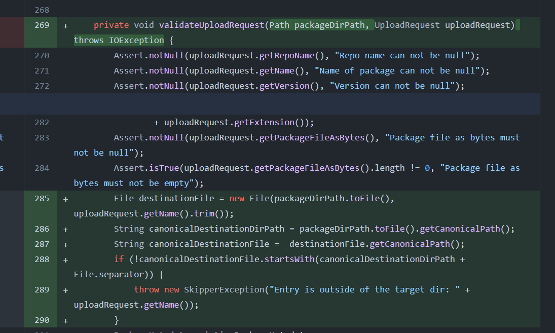 然后再判断上传目录是否以临时目录开头,若进行了目录遍历(像上面临时目录为/tmp/upload,目标目录为/yyjccc)就会抛出异常,就无法继续下去,因此也是修复了漏洞