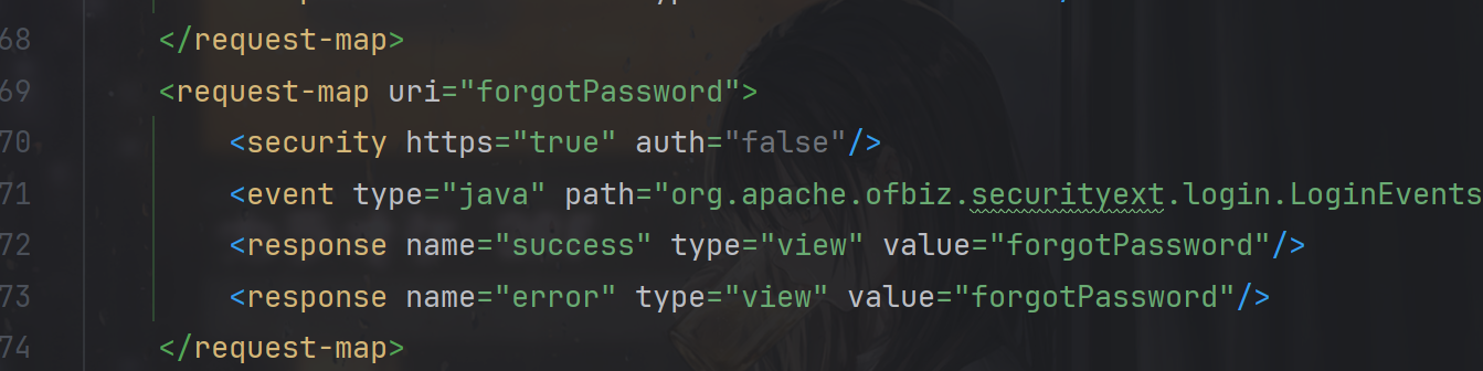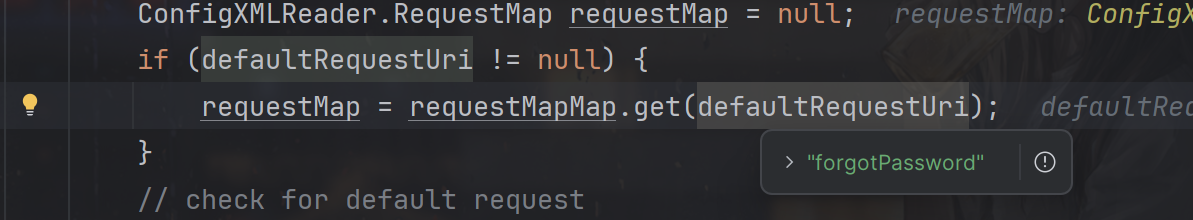 在xml中获取request-map标签的相关信息,在security标签中保存了接口是否需要鉴权的信息,当该接口无需身份验证就能访问时auth的值就为false,从下图中我们可以看到forgotPassword是无需鉴权的