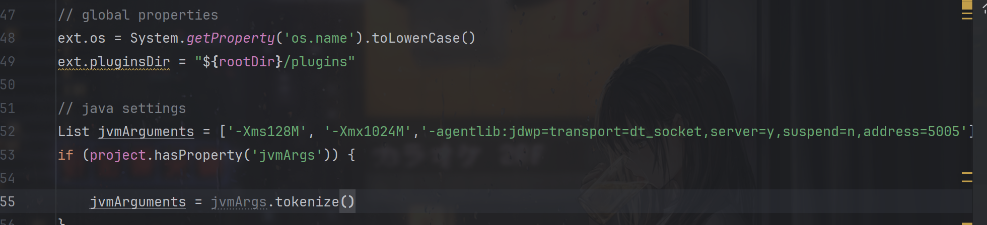 List jvmArguments = ['-Xms128M', '-Xmx1024M','-agentlib:jdwp=transport=dt_socket,server=y,suspend=n,address=5005'] |